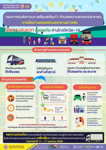 ด้านความปลอดภัย กรมการขนส่งทางบกได้ดำเนินการมาอย่างต่อเนื่องตั้งแต่ช่วงก่อนเทศกาล โดยมีการตรวจความพร้อมและให้คำแนะนำการตรวจสภาพรถและการเตรียมความพร้อมพนักงานขับรถ ณ สถานประกอบการของผู้ประกอบการขนส่งด้วยรถโดยสารสาธารณะทั่วประเทศโดยจะดำเนินการอย่างเข้มข้นและต่อเนื่องจนกว่าจะสิ้นสุดช่วงการเดินทางของประชาชน นอกจากนี้ ในช่วงระหว่างวันที่ 11 – 17 เมษายน 2565 ซึ่งเป็นช่วงที่ประชาชนเดินทาง ให้สำนักงานขนส่งทุกแห่งดำเนินการตรวจความพร้อมรถโดยสารสาธารณะและพนักงานขับรถก่อนเดินทางทุกคันทุกคน ณ สถานีขนส่งผู้โดยสารและจุดจอดรถทุกแห่งทั่วประเทศ พนักงานขับรถทุกคนต้องพร้อมสำหรับการให้บริการด้วยความปลอดภัย มีใบอนุญาตขับรถที่ถูกต้อง ไม่มีสารเสพติด และปริมาณแอลกอฮอล์ในลมหายใจ