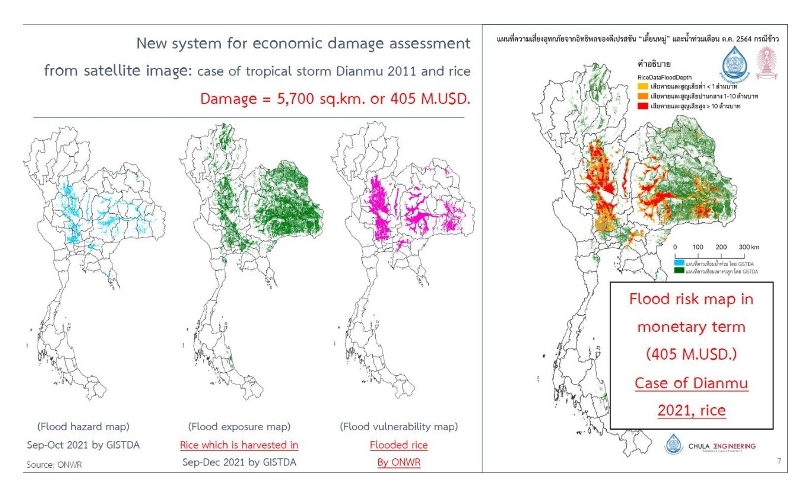 ผศ.ดร.พงษ์ศักดิ์ สุทธินนท์ คณะวิศวกรรมศาสตร์ จุฬาลงกรณ์มหาวิทยาลัย กล่าวว่า สภาวะโลกร้อนได้ส่งผลกระทบต่อสถานการณ์น้ำในประเทศไทยในระดับที่รุนแรง สร้างความเสียหายแก่เศรษฐกิจและสังคมมหาศาล โดยเฉพาะในปีที่ผ่านมาก็ได้รับผลกระทบจากโควิด-19 ดังนั้น จึงจำเป็นต้องลดผลกระทบที่เกิดจากภัยแล้ง-อุทกภัยให้ได้มากที่สุด จึงได้มีการรวบรวมข้อมูลทางสถิติ ผลกระทบและความเสียหายที่เกิดขึ้นในรูปแบบของจำนวนเงิน ที่เกิดขึ้นจากภัยแล้งและอุทกภัย แล้วนำมาจัดทำเป็นแผนที่ความเสี่ยงรายพื้นที่ แผนที่นี้จะช่วยให้หน่วยงานที่เกี่ยวข้องสามารถออกแบบการจัดการความเสี่ยงได้มีประสิทธิภาพมากขึ้น ดังนั้น ควรนำงานวิจัยที่มี และนำแผนที่ความเสี่ยงไปประยุกต์ใช้กับการบริหารจัดการลุ่มน้ำ เพื่อใช้ในการวางแผนและดำเนินงาน ลดผลกระทบจากการเปลี่ยนแปลงสภาพบรรยากาศแบบสุดโต่ง