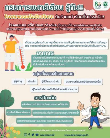 กรมการแพทย์ โดยสถาบันประสาทวิทยา เตือนประชาชนให้ระวังโรคลมแดดหรือฮีทสโตรก เนื่องจากสภาพอากาศที่ร้อนจัดของประเทศไทยในช่วงนี้ ทำให้เกิดปัญหาสุขภาพ โรคนี้เกิดได้ทุกเพศทุกวัย และอันตรายถึงชีวิต