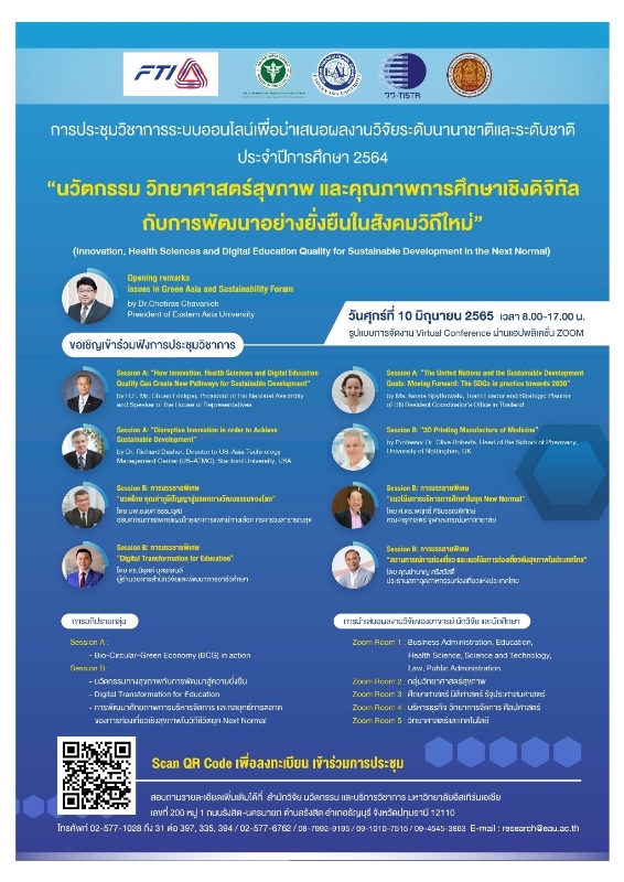 กระทรวงการอุดมศึกษา  วิทยาศาสตร์  วิจัยและนวัตกรรม (อว.)   โดย  สถาบันวิจัยวิทยาศาสตร์และเทคโนโลยีแห่งประเทศไทย (วว.)   ร่วมกับพันธมิตร จัด ประชุมวิชาการออนไลน์นำเสนอผลงานวิจัยระดับนานาชาติ/ระดับชาติ ประจำปีการศึกษา 2564 ในหัวข้อเรื่อง “นวัตกรรม วิทยาศาสตร์สุขภาพและคุณภาพการศึกษาเชิงดิจิทัลกับการพัฒนาอย่างยั่งยืนในสังคมวิถีใหม่” ในวันศุกร์ที่ 10 มิถุนายน 2565 เวลา 08.00-17.00 น. ในรูปแบบการจัดงาน Virtual  Conference ผ่านแอพพลิเคชั่น ZOOM  โดยมีหัวข้อการประชุมที่น่าสนใจ อาทิ