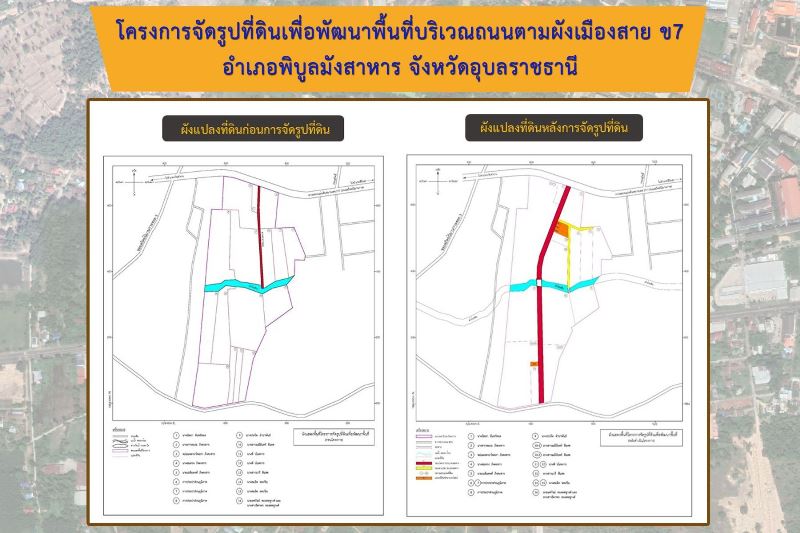 สำนักงานโยธาธิการและผังเมืองจังหวัดอุบลราชธานีจึงร่วมกับเทศบาลเมืองพิบูลมังสาหารและเทศบาลตำบลกุดชมภู ดำเนินโครงการจัดรูปที่ดินเพื่อพัฒนาพื้นที่ในเขตผังเมืองรวมเมืองพิบูลมังสาหาร บริเวณถนนตามผังเมืองสาย ข7 อำเภอพิบูลมังสาหาร บนพื้นที่โครงการ 96 – 2 – 87.90 ไร่ แปลงที่ดิน 16 แปลง เจ้าของที่ดิน 13 ราย กรมโยธาธิการและผังเมืองจัดสรรงบประมาณ 24,742,000 บาท เพื่อก่อสร้างถนนตามผังเมืองสาย ข7 ทำหน้าที่เชื่อมโยงถนนสถิตย์นิมานกาล หรือทางหลวงแผ่นดินหมายเลข 217 กับถนนเลี่ยงเมืองพิบูลมังสาหาร ขนาดเขตทาง 15 เมตร ระยะทาง 670 เมตร พร้อมระบบระบายน้ำ ขยายเขตไฟฟ้า ประปา ก่อสร้างสะพานข้ามลำห้วยซัน 1 แห่ง และเจ้าของที่ดินได้จัดหางบประมาณจากการจำหน่ายที่ดินจัดหาประโยชน์ มาสนับสนุนการก่อสร้างถนนสายรอง เขตทาง 6 เมตร ระยะทาง 315 เมตร และท่อลอดเหลี่ยมข้ามห้วยซัน 1 แห่ง พร้อมระบบระบายน้ำ 1,672,676 บาท