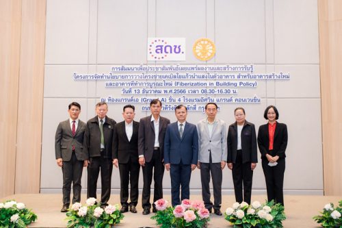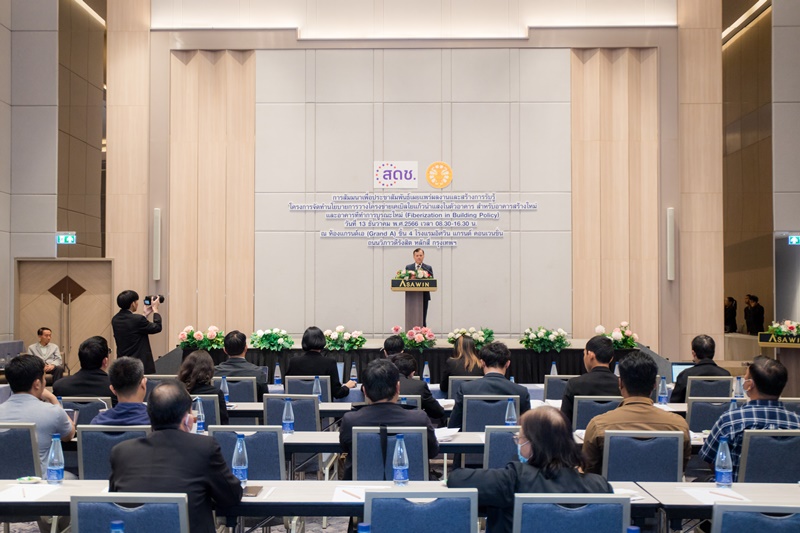 วันที่ 13 ธันวาคม 2566 นายภุชพงค์ โนดไธสง เลขาธิการคณะกรรมการดิจิทัลเพื่อเศรษฐกิจและสังคมแห่งชาติ เป็นประธานเปิดงานสัมมนาประชาสัมพันธ์เผยแพร่ผลงาน และสร้างการรับรู้โครงการจัดทำนโยบายการวางโครงข่ายเคเบิลใยแก้วนำแสงในตัวอาคาร สำหรับอาคารสร้างใหม่ และอาคารที่ทำการบูรณะใหม่ (Fiberization in Building Policy) ณ โรงแรมอัศวิน แกรนด์ คอนเวนชั่น กรุงเทพฯ โดยการดำเนินโครงการมีวัตถุประสงค์เพื่อวางกรอบนโยบายในการผลักดัน และส่งเสริมให้แต่ละอาคารมีการวางโครงข่ายเคเบิลใยแก้วนำแสงในตัวอาคาร โดยเฉพาะอาคารที่มีความสำคัญทางเศรษฐกิจ และมีผู้เข้าอยู่หรือเข้าใช้สอยจำนวนมาก รวมทั้งจัดทำแนวปฏิบัติซึ่งเป็นข้อแนะนำพื้นฐานในการออกแบบ และติดตั้งระบบสายเคเบิลใยแก้วนำแสงในตัวอาคาร สำหรับอาคารสร้างใหม่ และอาคารที่ทำการบูรณะใหม่ ในรูปแบบ Fiber-to-the-Home (FTTH) ให้กับเจ้าของอาคาร และผู้ให้บริการโครงข่ายโทรคมนาคม ทำให้โครงสร้างพื้นฐานเทคโนโลยีดิจิทัลภายในอาคารมีความพร้อมสำหรับการรับส่งข้อมูลด้วยความเร็วระดับกิกะบิต สามารถรองรับการใช้งานแอปพลิเคชัน บริการดิจิทัล และเทคโนโลยีในอนาคตที่มีความต้องการด้านการรับส่งข้อมูลปริมาณมากด้วยความรวดเร็ว อาทิ การประมวลผลแบบคลาวด์ (Cloud Computing) แอปพลิเคชัน AR/VR การวิเคราะห์และบริหารข้อมูลขนาดใหญ่ (Big Data) เป็นต้น รวมทั้งสามารถรองรับผู้ให้บริการโทรคมนาคมจำนวนหลายรายในการเข้าไปให้บริการภายในอาคาร เพื่อสร้างทางเลือกในการใช้บริการโทรคมนาคมให้กับผู้ใช้อาคาร ซึ่งจะช่วยส่งเสริมให้เกิดการเข้าถึง และใช้ประโยชน์จากเทคโนโลยีดิจิทัลในการขับเคลื่อนการพัฒนาเศรษฐกิจและสังคมของประเทศเพื่อสร้างความแข็งแกร่งให้กับเศรษฐกิจไทย