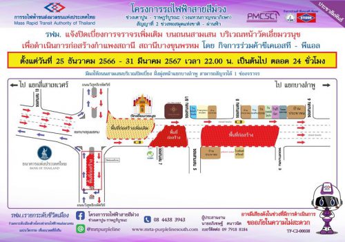 การรถไฟฟ้าขนส่งมวลชนแห่งประเทศไทย (รฟม.) แจ้งว่า กิจการร่วมค้า ซีเคเอสที – พีแอล ผู้รับจ้างออกแบบและก่อสร้างอุโมงค์ทางวิ่งและสถานีใต้ดิน โครงการรถไฟฟ้าสายสีม่วง ช่วงเตาปูน – ราษฎร์บูรณะ (วงแหวนกาญจนาภิเษก) สัญญาที่ 2 ช่วงหอสมุดแห่งชาติ – ผ่านฟ้า แจ้งปิดเบี่ยงจราจรเพิ่มเติม 3 ช่องจราจร บนถนนสามเสน บริเวณแยกบางขุนพรหม ถึง บริเวณหน้าวัดเอี่ยมวรนุช เพื่อดำเนินงานก่อสร้างกำแพงสถานี บริเวณสถานีบางขุนพรหม ตั้งแต่วันที่ 25 ธันวาคม 2566 – 31 มีนาคม 2567 เวลา 22.00 น. เป็นต้นไป ตลอด 24 ชั่วโมง มีผลให้ถนนสามเสนบริเวณปิดเบี่ยง ฝั่งมุ่งหน้าแยกบางลำพู สามารถสัญจรได้ 1 ช่องจราจร ทั้งนี้ ประชาชนสามารถเข้าออกที่พักอาศัยได้ตามปกติ