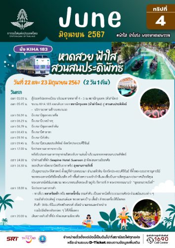 นายเอกรัช ศรีอาระยันพงษ์ หัวหน้าสำนักงานผู้ว่าการ การรถไฟแห่งประเทศไทย เปิดเผยว่า ในเดือนพฤษภาคม – มิถุนายน 2567 การรถไฟฯ ขอเชิญชวนท่องเที่ยวทริปพิเศษ กับขบวนรถไฟ KIHA 183 ภายใต้คอนเซ็ปท่องไปตามสายลมในเดือนพฤษภาคม และฟ้าใส ป่าโปร่ง พฤกษานานาพรรณในเดือนมิถุนายน รวม 14 ทริป 9 เส้นทาง โดยพาทุกท่านร่วมเดินทางไปในเส้นทาสายต่างๆ หลายรูปแบบ ตอบโจทย์ทุกไลฟ์สไตล์ ทั้งสายมู สายธรรมชาติ และสายชอป ชิม ชิว ทั้งแบบไปเช้ากลับเย็น หรือแบบพักค้างคืน ทุกวันเสาร์และอาทิตย์ ตลอด 2 เดือนเต็ม