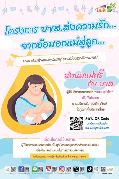 นายอรรถวิท รักจำรูญ กรรมการฯ รักษาการแทนกรรมการผู้จัดการใหญ่ บริษัท ขนส่ง จำกัด (บขส.) เปิดเผยว่า เนื่องในโอกาสวันเฉลิมพระชนมพรรษา สมเด็จพระนางเจ้าสิริกิติ์ พระบรมราชินีนาถ พระบรมราชชนนีพันปีหลวง 12 สิงหาคม 2567 และเพื่อสนับสนุน ส่งเสริมให้ความสำคัญในการเลี้ยงลูกด้วยนมแม่ บขส. ได้จัดโครงการ “บขส. ส่งความรักจากอ้อมอกแม่สู่ลูก” เพื่อให้บริการส่งนมแม่แช่แข็ง (น้ำหนักไม่เกิน 10 กิโลกรัมต่อบรรจุภัณฑ์) ฟรีไม่คิดค่าใช้จ่าย ผ่านบริการรับ-ส่งพัสดุภัณฑ์ “One Day One Night” ส่งเช้าถึงเย็น ส่งเย็นถึงเช้า ทั่วทุกภูมิภาคในประเทศไทย