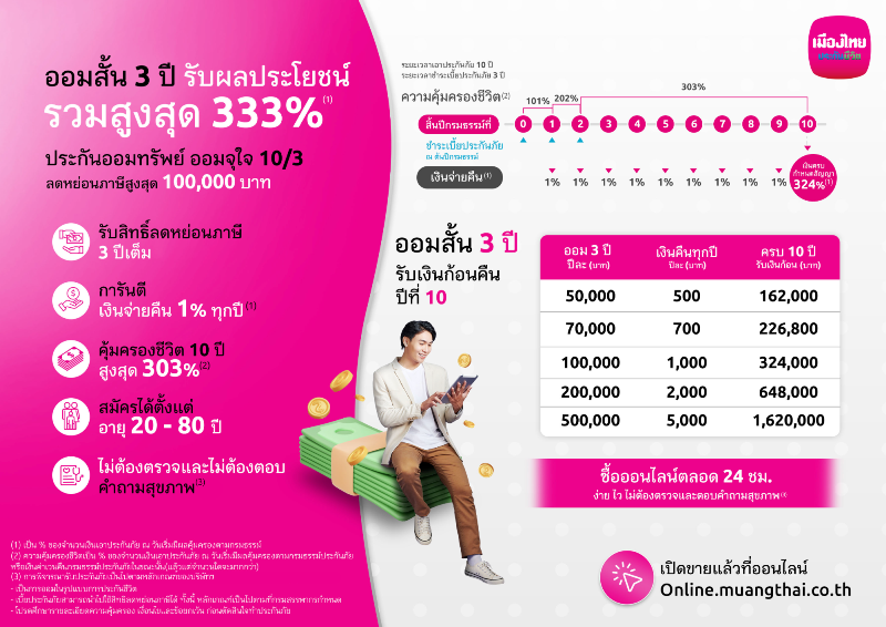 โดยความโดดเด่นของ ประกันออมทรัพย์ “ออมจุใจ 10/3” อยู่ที่การตอบโจทย์ความต้องการแบบจุใจ ทั้งด้านการออม ผลประโยชน์ทางภาษี และความคุ้มครองชีวิต ด้วยผลประโยชน์รวมสูงสุด 333%(1) จ่ายเบี้ย สั้น ๆ 3 ปี แต่คุ้มครองยาวถึง 10 ปี ลดหย่อนภาษีสูงสุด 100,000 บาท รับเงินคืนทุกปีกรมธรรม์ปีละ 1%(1) ซื้อออนไลน์ ไม่ต้องตรวจและไม่ต้องคำถามสุขภาพ(2) ซื้อได้ตั้งแต่อายุ 20-80 ปี สะดวกในการเลือกซื้อเพียงเข้าไปที่ webmtl.co/47yeSNn มีให้เลือกได้จุใจถึง 5 แผน เลือกได้ในแบบที่เป็นคุณ