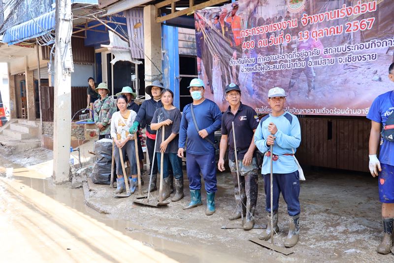 ด้าน นายบุญสงค์ ทัพชัยยุทธ์ ปลัดกระทรวงแรงงาน กล่าวว่า พื้นที่ที่ได้รับผลกระทบจากสถานการณ์อุทกภัยในครั้งนี้เกิดจากความร่วมมือของทุกหน่วยงานสังกัดกระทรวงแรงงานร่วมกับเทศบาลตำบลแม่สาย เทศบาลตำบลแม่สายมิตรภาพ และ อบต.ป่าตึง ผู้ใหญ่บ้าน และชาวบ้านในชุมชน เพื่อช่วยกันชำระล้างทำความสะอาดถนน อาคารบ้านเรือน คู คลองระบายน้ำ ทั้ง 4 จุด ได้แก่ ชุมชนเกาะทราย ตลาดนัดสายลมจอย ชุมชนไม้ลุงขน และ ชุมชนเหมืองแดง ต.แม่สาย อ.แม่สาย จ.เชียงราย ซึ่งโครงการนี้ดำเนินการจ้างงานตั้งแต่วันที่ 9 – 13 ตุลาคม 2567 เมื่อแล้วเสร็จจะเกิดประโยชน์กับพี่น้องประชาชนทำให้การสัญจรไปมาสะดวก ฟื้นฟูสภาพความเป็นอยู่ทำให้ประชาชนกลับมาประกอบอาชีพเป็นปกติโดยเร็วต่อไป ทั้งนี้ สามารถติดต่อสอบถามแจ้งขอความช่วยเหลือได้ที่ สายด่วนกระทรวงแรงงาน โทร.1506