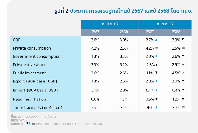 - เศรษฐกิจไทยมีแนวโน้มขยายตัว 2.7% ในปี 2567 และ 9% ในปี 2568 โดยเติบโตต่อเนื่องจาก 1.9% เมื่อปี 2566 ด้วยแรงหนุนจากภาคการท่องเที่ยว และการบริโภคภาคเอกชน ซึ่งได้รับอานิสงส์จากมาตรการกระตุ้นเศรษฐกิจของภาครัฐ รวมถึงการส่งออกที่ปรับตัวดีขึ้นตามความต้องการสินค้ากลุ่มอิเล็กทรอนิกส์ในตลาดโลก อย่างไรก็ตาม การฟื้นตัวยังมีความแตกต่างกันในแต่ละภาคส่วน โดยการส่งออกสินค้าและการผลิตภาคอุตสาหกรรมบางกลุ่ม รวมถึง SMEs ยังถูกกดดันจากปัจจัยเชิงโครงสร้าง