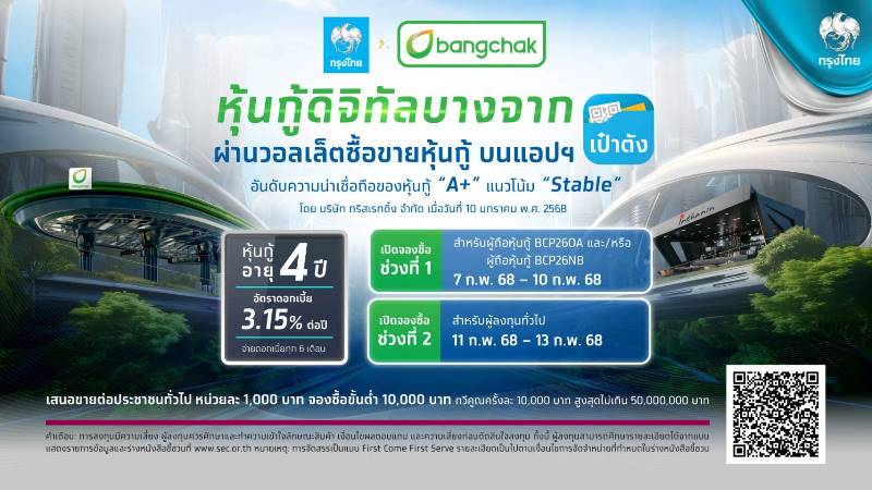 บริษัท บางจาก คอร์ปอเรชั่น จำกัด (มหาชน) และ ธนาคารกรุงไทย พร้อมเสนอขาย “หุ้นกู้ดิจิทัลบางจาก ครั้งที่ 1/2568” อายุ 4 ปี ดอกเบี้ย 3.15% ต่อปี วงเงินรวม 3,000 ล้านบาท ผ่านบริการซื้อขายหุ้นกู้บนแอปพลิเคชันเป๋าตัง ให้สิทธิ์ผู้ถือหุ้นกู้ดิจิทัลบางจากจองซื้อก่อน ลงทุนเริ่มต้นเพียง 10,000 บาท “จองก่อน ได้ก่อน” เปิดจองซื้อ 7-13 ก.พ.68 ผู้ลงทุนทั่วไปจองซื้อ 11-13 ก.พ.68