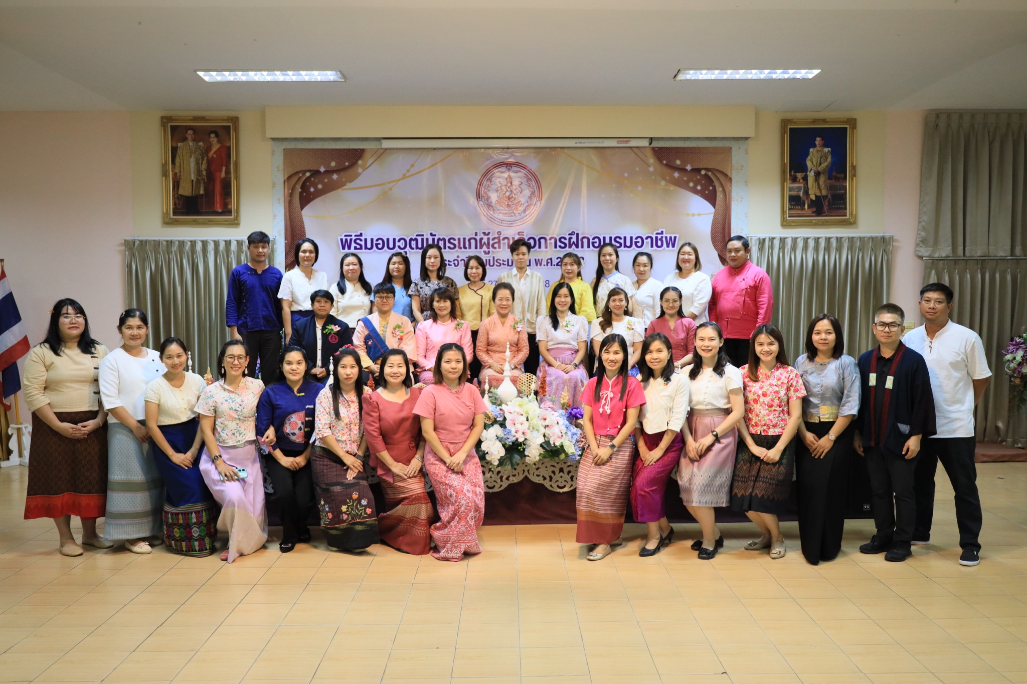 มีผู้เข้ารับมอบวุฒิบัตรการฝึกอบรมอาชีพภายในสถาบัน 6 หลักสูตร ประกอบด้วย หลักสูตรตัดผมชาย – ทำสีเบื้องต้น, หลักสูตรถ่ายคลิป/ตัดต่อวิดีโอ ด้วยมือถือ สร้างอาชีพนักรีวิว , หลักสูตรครัวซอง & พาย หลักสูตรอาหารฟิวชั่น, หลักสูตรขนมปังมินิ และหลักสูตรไอติมโบราณ มีผู้เข้ารับมอบวุฒิบัตรการฝึกอบรมอาชีพภายในชุมชน “กิจกรรมสร้างชีวิตใหม่ให้สตรีและครอบครัว” จำนวน 4 กลุ่ม ประกอบด้วย กลุ่มอาชีพหลักสูตรผลิตภัณฑ์งานผ้าปักลาย บ้านธิหลวง ต.บ้านธิ อ.บ้านธิ จ.ลำพูน, กลุ่มอาชีพหลักสูตรการผลิตภัณฑ์แปรรูปผ้ามัดย้อม เทศบาลตำบลเหมืองง่า อ.เมือง จ.ลำพูน, กลุ่มอาชีพหลักสูตรงานผ้าปักอัตลักษณ์ชุมชน เทศบาลตำบลทาทุ่งหลวง อ.แม่ทา จ.ลำพูน, กลุ่มอาชีพหลักสูตรงานหัตถศิลป์ไผ่ตอก บ้านใหม่แม่เตี๊ยะ ต.ดอยแก้ว อ.จอมทอง จ.เชียงใหม่ รวมมีผู้สำเร็จการฝึกอบรมอาชีพที่เข้ารับมอบวุฒิบัตรในวันนี้ทั้งสิ้น จำนวน 121 คน ณ ห้องประชุมอาคารราตรี
