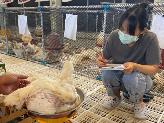 วว. นำผลิตภัณฑ์จิ้งหรีดหมักไปทดลองเลี้ยงไก่เนื้อ โดยเสริมในอาหารเลี้ยงไก่ที่ 3 เปอร์เซ็นต์พบว่า มีความปลอดภัยสูงต่อไก่ โดยในช่วงอายุไก่เนื้อ 21 วัน ตรวจไม่พบปริมาณเชื้อก่อโรค Salmonella sp. และ E. coli ในลำไส้ ซึ่งให้ผลดีต่อสุขภาพไก่ในช่วงระยะเวลานี้ เนื่องจากช่วงอายุ 10 – 21 วัน ภูมิคุ้มกัน ( IgY ) ที่ลูกไก่ได้รับจากแม่จะต่ำและเป็นช่วงที่ลูกไก่อ่อนแอ โดยเมื่อเสริมสุขภาพไก่ด้วยผลิตภัณฑ์จิ้งหรีดหมักจะไปช่วยลดปริมาณเชื้อก่อโรคทั้งสองได้ และช่วยส่งเสริมการเจริญของจุลินทรีย์ในกลุ่มแบคทีเรียกรดแลคติกในลำไส้ให้มีปริมาณที่เพิ่มขึ้น ซึ่งจะส่งผลดีต่อสุขภาพไก่เนื้อ ช่วยต้านการอักเสบในร่างกาย เมื่อผ่าซากไก่พบว่าอวัยวะภายในไก่ปกติ