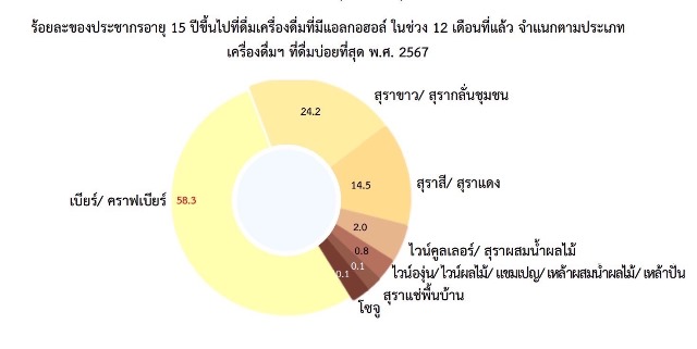 เมื่อพิจารณาถึงประเภทของเครื่องดื่มแอลกอฮอล์ที่ดื่มบ่อยที่สุด พบว่า เบียร์และคราฟเบียร์เป็นเครื่องดื่มที่ได้รับความนิยมสูงสุด (ร้อยละ 58.3) รองลงมาเป็น สุราขาว/สุรากลั่นชุมชน/เหล้าจีน/ยาดองเหล้า/เหล้าบ๊วย (ร้อยละ 24.2) และสุราสี/สุราแดง (ร้อยละ 14.5)