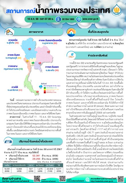 4.ข่าวประชาสัมพันธ์ : วานนี้(9 ส.ค. 68) นายประเสริฐ จันทรรวงทอง รองนายกรัฐมนตรี และรัฐมนตรีว่าการกระทรวงดิจิทัลเพื่อเศรษฐกิจและสังคม ในฐานะประธานกรรมการทรัพยากรน้ำแห่งชาติ (กนช.) เปิดเผยว่า ได้รับรายงานการประเมินสถานการณ์ของพายุโซนร้อน “โพดุล” (PODUL) ในมหาสมุทรแปซิฟิก พบว่าจะไม่ส่งผลกระทบโดยตรงต่อประเทศไทย โดยขณะนี้พายุกำลังเคลื่อนตัวทางทิศตะวันตกไปยังเกาะไต้หวัน และคาดว่าจะเคลื่อนผ่านไต้หวันในวันที่ 13 ส.ค. 68 ก่อนขึ้นฝั่งที่มณฑลฝูเจี้ยน ประเทศจีน และสลายตัวลง อย่างไรก็ตาม คาดว่าอิทธิพลของพายุดังกล่าวจะส่งผลให้มรสุมตะวันตกเฉียงใต้มีกำลังแรงขึ้น ทำให้มีความเสี่ยงเกิดฝนตกหนักในบางพื้นที่ของประเทศไทย บริเวณภาคเหนือตอนบน ภาคตะวันออกเฉียงเหนือตอนบน รวมทั้งพื้นที่ริมฝั่งแม่น้ำโขง ไปจนถึงภาคตะวันออก และภาคใต้ฝั่งทะเลอันดามัน จึงได้สั่งการให้สำนักงานทรัพยากรน้ำแห่งชาติ (สทนช.) ติดตามสถานการณ์อย่างใกล้ชิดและแจ้งเตือนหน่วยงานให้เตรียมความพร้อมตามกลไกมาตรการรับมือฤดูฝนปี 2568 อย่างเคร่งครัด