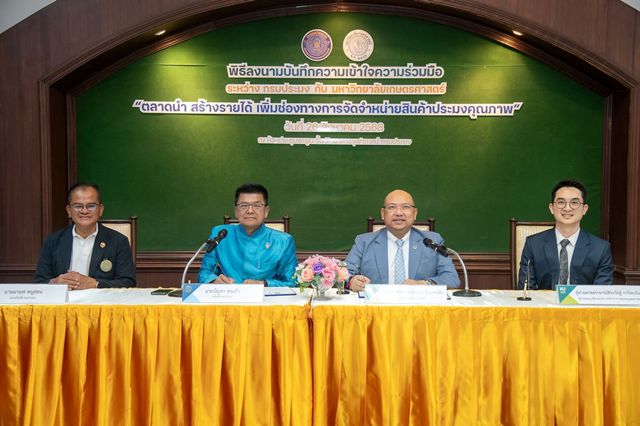 26 สิงหาคม 2568 – กรมประมงร่วมกับมหาวิทยาลัยเกษตรศาสตร์ ลงนามบันทึกความเข้าใจความร่วมมือ “ตลาดนำ สร้างรายได้ เพิ่มช่องทางการจำหน่ายสินค้าประมงคุณภาพ” เพื่อพัฒนาขีดความสามารถด้านการตลาด และขยายช่องทางจำหน่ายสินค้าประมงคุณภาพสู่ผู้บริโภค โดยมี นายบัญชา สุขแก้ว อธิบดีกรมประมง และ ผศ.ดร.ธงรบ รื่นบรรเทิง คณบดีคณะมนุษยศาสตร์ มหาวิทยาลัยเกษตรศาสตร์ เป็นผู้ลงนาม พร้อมด้วย คณะผู้บริหารจากทั้งสองหน่วยงานร่วมเป็นสักขีพยาน ณ ห้องประชุมพะยูน อาคารจุฬาภรณ์ กรมประมง