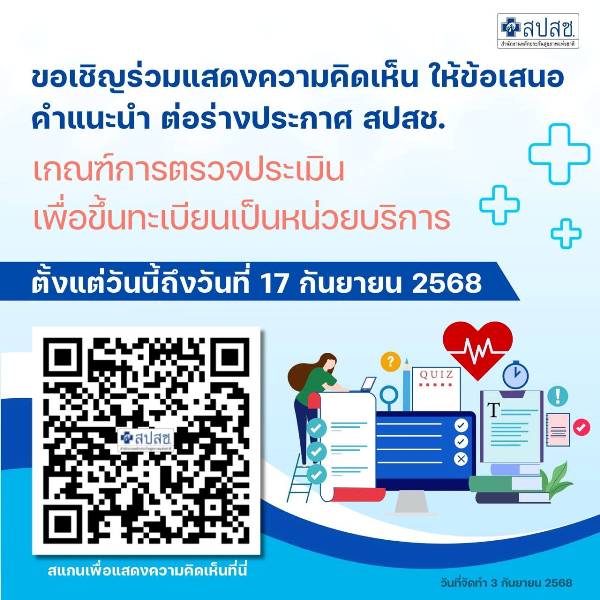 สปสช. ขอเชิญร่วมแสดงความคิดเห็นเรื่อง เกณฑ์การตรวจประเมินเพื่อขึ้นทะเบียนเป็นหน่วยบริการ วันนี้ – 17 ก.ย.68