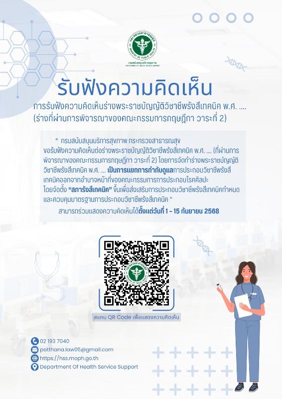 กรมสนับสนุนบริการสุขภาพ (สบส.) กระทรวงสาธารณสุข เชิญชวนผู้ประกอบวิชาชีพรังสีเทคนิคและผู้ที่เกี่ยวข้องร่วมแสดงความคิดเห็นต่อ ร่างพระราชบัญญัติวิชาชีพรังสีเทคนิค พ.ศ. … เพื่อยกระดับมาตรฐานการประกอบวิชาชีพ จัดตั้ง “สภารังสีเทคนิค” คุ้มครองสิทธิและความปลอดภัยของประชาชน พร้อมป้องกันการแสวงหาผลประโยชน์โดยมิชอบ