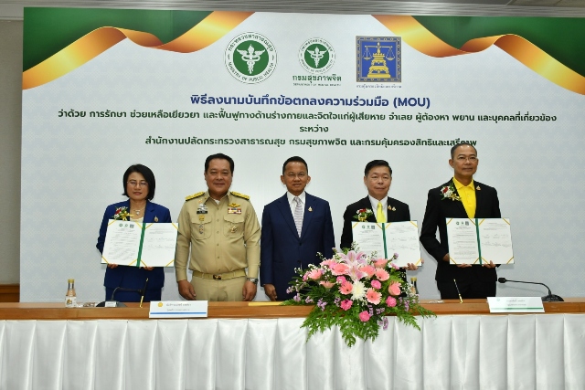 สำนักงานปลัดกระทรวงสาธารณสุข ร่วมกับ กรมสุขภาพจิต กรมคุ้มครองสิทธิและเสรีภาพ ลงนามบันทึกข้อตกลงความร่วมมือ ว่าด้วยการรักษา ช่วยเหลือเยียวยา และฟื้นฟูทางด้านร่างกายและจิตใจแก่ผู้เสียหาย จำเลย ผู้ต้องหา พยาน และบุคคลที่เกี่ยวข้อง ให้เข้าถึงระบบการดูแลทั้งสุขภาพกาย สุขภาพจิต ครอบคลุมความคุ้มครองตามสิทธิขั้นพื้นฐานและกฎหมาย อย่างต่อเนื่องไร้รอยต่อ เท่าเทียมและเป็นธรรม