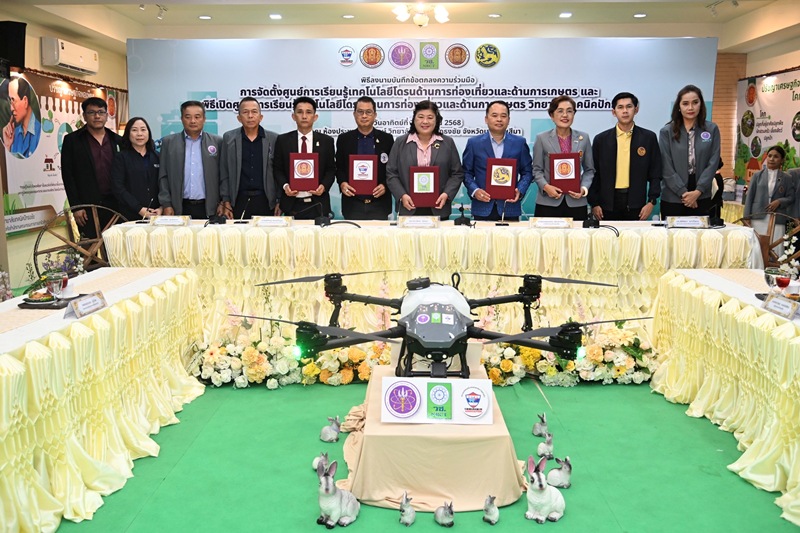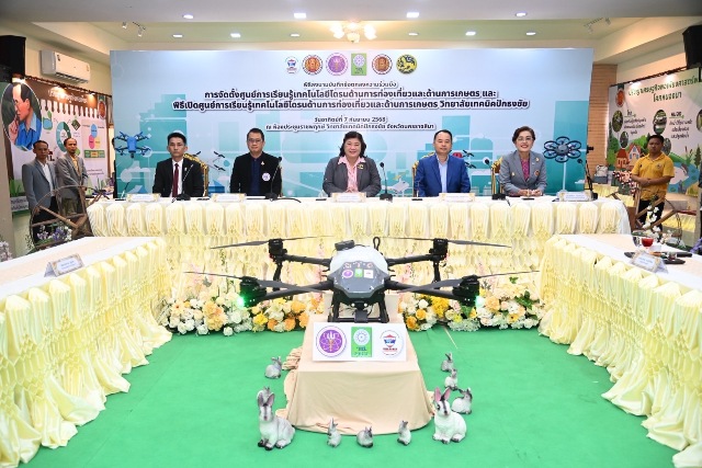 วันอาทิตย์ที่ 7 กันยายน 2568 สำนักงานการวิจัยแห่งชาติ(วช.) กระทรวงการอุดมศึกษา วิทยาศาสตร์ วิจัยและนวัตกรรม ร่วมกับ สมาคมกีฬาเครื่องบินจำลองและวิทยุบังคับ, วิทยาลัยเทคนิคปักธงชัย, วิทยาลัยเกษตรและเทคโนโลยีนครราชสีมา และอำเภอปักธงชัย ร่วมลงนามบันทึกข้อตกลงความร่วมมือการจัดตั้งศูนย์การเรียนรู้เทคโนโลยีโดรนด้านการท่องเที่ยวและด้านการเกษตร โดยมี ดร.วิภารัตน์ ดีอ่อง ผู้อำนวยการสำนักงานการวิจัยแห่งชาติ เป็นประธานในพิธี พร้อมด้วย ดร.สิริรัชนา เนาว์โสภา ผู้อำนวยการวิทยาลัยเทคนิคปักธงชัย กล่าวต้อนรับ, นายกฤษณธร เลิศสำโรง นายอำเภอปักธงชัย กล่าวถึงความสำคัญของการพัฒนาท้องถิ่น, นายพิศิษฐ์ มิตรเกื้อกูล นายกสมาคมกีฬาเครื่องบินจำลองและวิทยุบังคับ กล่าวรายงาน พร้อมนี้ ผู้ทรงคุณวุฒิ วช. คณาจารย์ ผู้นำและเจ้าหน้าที่หน่วยงานในท้องถิ่นเข้าร่วมในพิธี ณ วิทยาลัยเทคนิคปักธงชัย จังหวัดนครราชสีมา