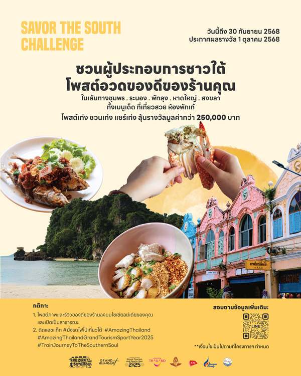 กิจกรรมชวนผู้ประกอบการชาวใต้อวดของดี Savor the South Challenge ชวนผู้ประกอบการชาวใต้ ในเส้นทาง ชุมพร – ระนอง – พัทลุง – หาดใหญ่ – สงขลา โพสต์อวดเมนูเด็ด ที่เที่ยวสวย ห้องพักเก๋ หรือของดีที่ร้านคุณภูมิใจนำเสนอ บนโซเชียลมีเดียของร้านคุณ