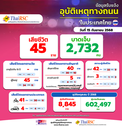 สถานการณ์อุบัติเหตุทางถนนในประเทศไทย วันที่ 15 กันยายน 2568 16 กันยายน 2025Thailandplusประชาสัมพันธ์ Facebook iconFacebookTwitter iconTwitterLINE iconLineสถานการณ์อุบัติเหตุทางถนนในประเทศไทย วันที่ 15 กันยายน 2568