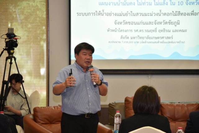 นอกจากนี้ ยังมีการนำเสนอผลการดำเนินงานโครงการวิจัยด้านการจัดการน้ำและการเกษตร ผ่านการฉายวิดีโอจากพื้นที่ต่าง ๆ ได้แก่ อำเภอแม่กลอง จังหวัดสมุทรสงคราม จังหวัดขอนแก่น จังหวัดกำแพงเพชร จังหวัดน่าน และจังหวัดเชียงใหม่ จากนั้นมีการนำเสนอผลงานวิจัยในสถานที่จริง ได้แก่ โครงการมะม่วงฉลาด และ โครงการถั่วเหลือง และยังมีการเสวนาเรื่องทิศทางความร่วมมือการจัดการน้ำระหว่างภาครัฐและเอกชนในภาคตะวันออกเฉียงเหนือ โดย ดร.ทวีสันต์ วิชัยวงษ์ ประธานสภาอุตสาหกรรมจังหวัดขอนแก่น นายจักรกฤษณ์ ศิริพานิชย์ ประธานหอการค้าจังหวัดขอนแก่น นายสิทธิชัย ดวงดี วิศวกรชลประทานกลุ่มมิตรผล บริษัท น้ำตาลมิตรผล จำกัด และ ดร.อนุวรรตน์ ศรีสวัสดิ์ รองผู้อำนวยการฝ่ายยุทธศาสตร์และพัฒนาพื้นที่ และมีบทบาทเป็นผู้อำนวยการแผนงานในโครงการ เป็นผู้ดำเนินรายการ ร่วมสะท้อนปัญหาและแนวทางการแก้ไข บทบาทงานวิจัยที่เกี่ยวข้อง รวมถึงความร่วมมือที่ผ่านมาและความคาดหวังในอนาคต ก่อนที่จะมีการอภิปรายร่วมและสรุปแนวทางการพัฒนาต่อไป