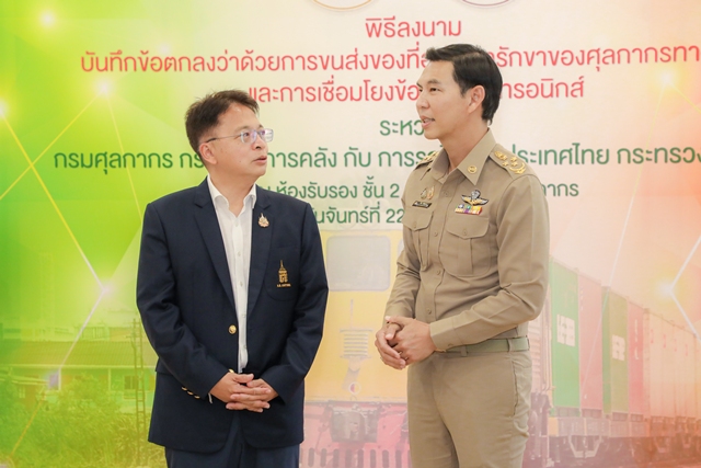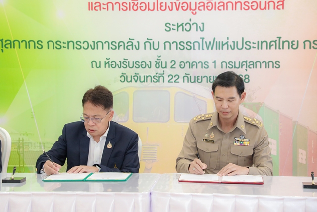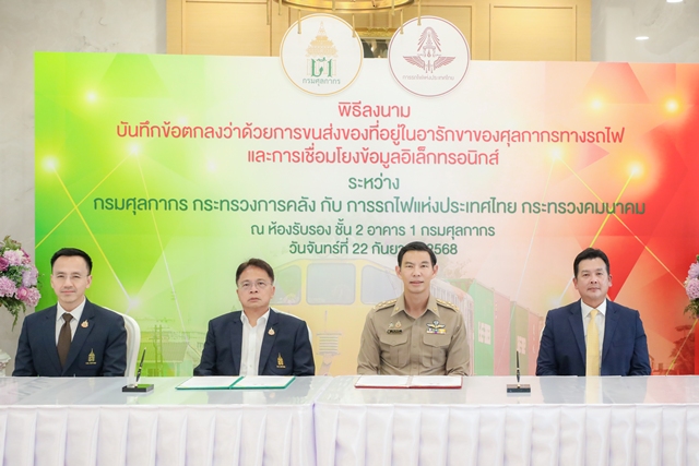 วันที่ 22 กันยายน 2568 ณ กรมศุลกากร นายวีริศ อัมระปาล ผู้ว่าการรถไฟแห่งประเทศไทย (รฟท.) และนายธีรัชย์ อัตนวานิช อธิบดีกรมศุลกากร ร่วมลงนามบันทึกข้อตกลงความร่วมมือ (MOU) ว่าด้วยการบูรณาการการขนส่งของที่อยู่ในอารักขาของศุลกากรทางรถไฟ และการเชื่อมโยงข้อมูลอิเล็กทรอนิกส์ระหว่างกรมศุลกากร กระทรวงการคลัง และการรถไฟแห่งประเทศไทย กระทรวงคมนาคม