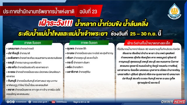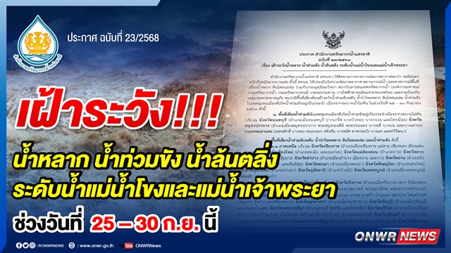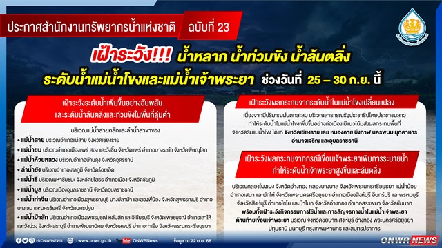 เฝ้าระวัง!!! น้ำหลาก น้ำท่วมขัง น้ำล้นตลิ่ง ระดับน้ำแม่น้ำโขงและแม่น้ำเจ้าพระยา ช่วง 25 – 30 กันยายนนี้