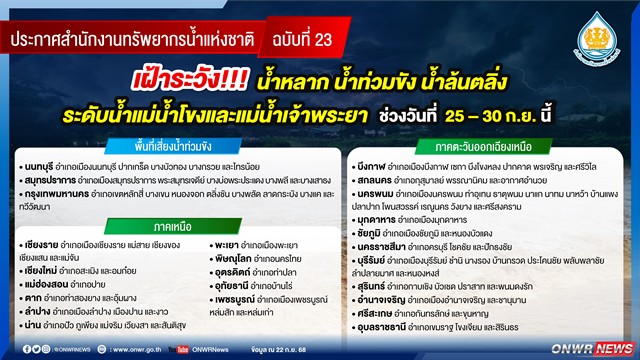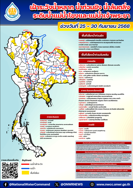 สำนักงานทรัพยากรน้ำแห่งชาติ (สทนช.) ได้ติดตามการคาดการณ์สภาพอากาศพบว่า จะมีฝนตกหนักถึงหนักมากบางแห่ง ทั้งนี้ สทนช. ได้ประเมินวิเคราะห์สภาพอากาศ สถานการณ์น้ำ และคาดการณ์พื้นที่เสี่ยงน้ำหลาก ดินโคลนถล่ม ร่วมกับกรมอุตุนิยมวิทยา สถาบันสารสนเทศทรัพยากรน้ำ (องค์การมหาชน) กรมทรัพยากรน้ำ กรมทรัพยากรธรณี กรมชลประทาน การไฟฟ้าฝ่ายผลิตแห่งประเทศไทย และกรมป้องกันและบรรเทาสาธารณภัย พบว่ามีพื้นที่เสี่ยงต้องเฝ้าระวังน้ำท่วมฉับพลัน น้ำป่าไหลหลาก ดินโคลนถล่ม น้ำท่วมขังในเขตชุมชนเมืองที่เกิดน้ำท่วมขังอยู่เป็นประจำ เนื่องจากระบายน้ำไม่ทัน ในช่วงวันที่ 25 – 30 กันยายน 2568 ดังนี้