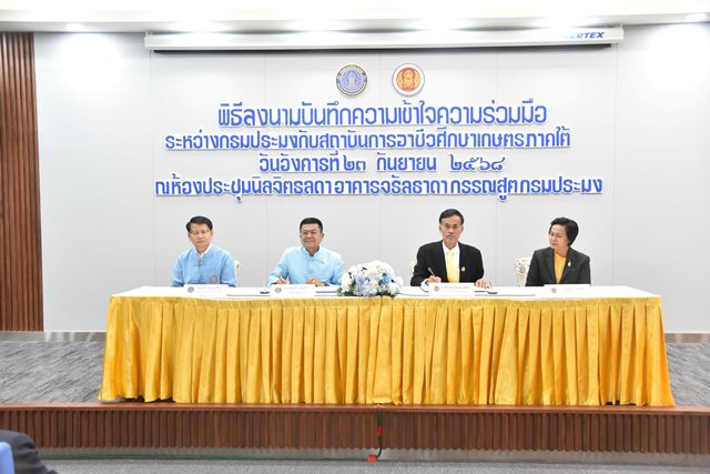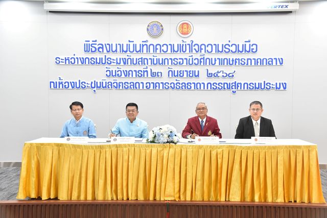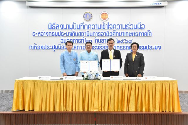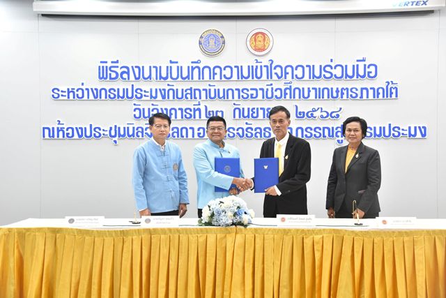23 กันยายน 2568 กรมประมงและสถาบันการอาชีวศึกษา ลงนามบันทึกความเข้าใจ (MOU) ความร่วมมือสนับสนุนการจัดอาชีวศึกษา ให้เป็นแหล่งการเรียนรู้ ฝึกทักษะ และประสบการณ์ เพื่อแก้ไขปัญหาในพื้นที่ และใช้ทรัพยากรประมงร่วมกันให้เกิดประโยชน์สูงสุด โดยมี นายบัญชา สุขแก้ว อธิบดีกรมประมง นายทองอาบ บุญอาจ ผู้อำนวยการวิทยาลัยเกษตรและเทคโนโลยีนครสวรรค์ รักษาราชการแทน ผู้อำนวยการสถาบันการอาชีวศึกษาเกษตรภาคกลาง และว่าที่ร้อยตรี นิพนธ์ ภู่พลับ ผู้อำนวยการสถาบันการอาชีวศึกษาเกษตรภาคใต้ เป็นผู้ลงนาม พร้อมด้วยคณะผู้บริหารทั้งสามหน่วยงานร่วมเป็นสักขีพยาน ณ ห้องประชุมนิลจิตรลดา อาคารจรัลธาดา กรรณสูต กรมประมง