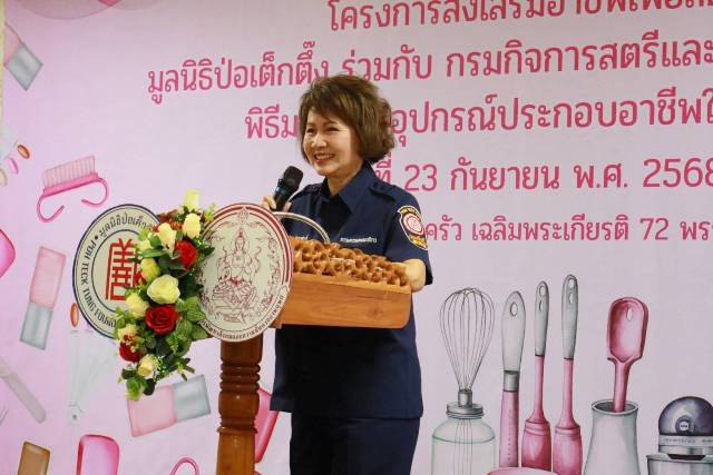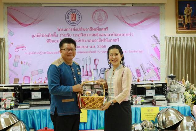 วันที่ 23 กันยายน 2568 นางรชยา ฮั่นตระกูล ผู้อำนวยการศูนย์เรียนรู้การพัฒนาสตรีและครอบครัวเฉลิมพระเกียรติ 72 พรรษา บรมราชินีนาถ จังหวัดลำพูน พร้อมด้วยข้าราชการ เจ้าหน้าที่ศูนย์ฯ ร่วมให้การต้อนรับ (นางศิริกุล โอภาสวงศ์) กรรมการและเลขาธิการมูลนิธิฯ พร้อมคณะผู้บริหารมูลนิธิป่อเต็กตึ๊ง เนื่องในโอกาสได้มามอบวัสดุอุปกรณ์สนับสนุนประกอบอาชีพแก่กลุ่มเป้าหมาย “โครงการส่งเสริมอาชีพเพื่อสตรี” ด้วยความร่วมมือระหว่าง กรมกิจการสตรีและสถาบันครอบครัว ร่วมกับ มูลนิธิป่อเต็กตึ๊ง ซึ่งได้พิจารณาให้การสนับสนุนการประกอบอาชีพให้แก่กลุ่มเป้าหมายผู้ที่ประสบปัญหาทางสังคม ที่เคยผ่านการฝึกอบรมด้านอาชีพจากศูนย์เรียนรู้ฯ จังหวัดลำพูน (จำนวน 10 ราย) ศูนย์เรียนรู้ฯ จังหวัดลำปาง (จำนวน 16 ราย) และศูนย์เรียนรู้ฯ จังหวัดเชียงราย (จำนวน 4 ราย) ซึ่งได้ลำดับพิธีการดังนี้ นางรชยา ฮั่นตระกูล ผู้อำนวยการศูนย์ฯ (กล่าวแนะนำศูนย์ฯ) นายชาตรี ธินนท์ รองผู้ว่าราชการจังหวัดลำพูน (กล่าวต้อนรับ และกล่าวขอบคุณ) นางศิริกุล โอภาสวงศ์ กรรมการและเลขาธิการมูลนิธิฯ (กล่าววัตถุประสงค์ฯ) และคุณอัญชลี จงคดีกิจ อาสา ฯ ศิลปิน (กล่าวแสดงความยินดี ร้องเพลงให้กำลังใจ) และได้ร่วมบันทึกภาพกับแขกผู้มีเกียรติ ได้แก่ ผู้บริหารมูลนิธิป่อเต็กตึ๊ง ผู้บริหารกรมกิจการสตรีและสถาบันครอบครัว ผู้อำนวยการศูนย์เรียนรู้การพัฒนาสตรีและครอบครัวฯ หัวหน้าส่วนราชการจังหวัดลำพูน หัวหน้าหน่วยงานสังกัดกระทรวงพม. จังหวัดลำพูน (ทีมพม.หนึ่งเดียว ลำพูน) รวมถึงผู้ที่ได้เข้ารับวัสดุอุปกรณ์ฯ ครบถ้วน จำนวนทั้งสิ้น 30 ราย ณ ห้องประชุมอาคารราตรี