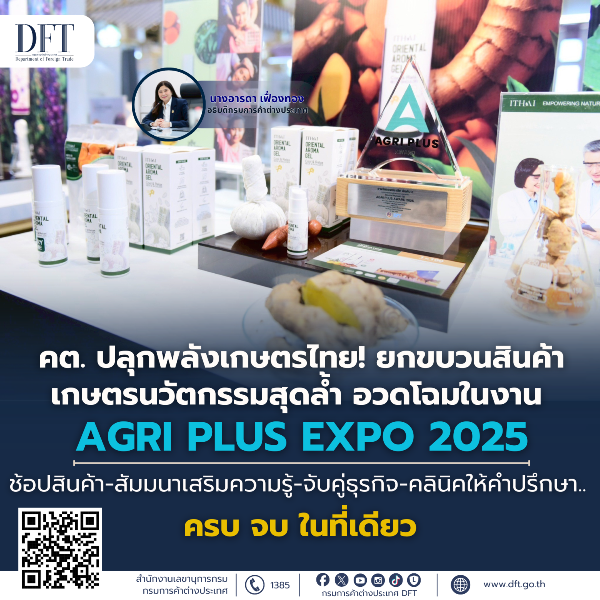 การจัดงาน Agri Plus Expo 2025 ในครั้งนี้ถือเป็นอีกหนึ่งกิจกรรมสำคัญภายใต้ภารกิจของกรมการค้าต่างประเทศในการส่งเสริมและผลักดันสินค้าเกษตรนวัตกรรมไทยให้เป็นที่ยอมรับในตลาดโลก โดยการพัฒนาศักยภาพผู้ประกอบการให้พร้อมแข่งขัน การสนับสนุนโครงสร้างธุรกิจให้ทันสมัย และการสร้างเครือข่ายความร่วมมือกับภาคส่วนต่าง ๆ เพื่อขับเคลื่อนเศรษฐกิจของประเทศด้วยนวัตกรรมอย่างยั่งยืน พร้อมกันนี้ ขอเชิญชวนผู้สนใจทุกภาคส่วนพบกับกิจกรรมดีๆ ในงาน Agri Plus Expo 2025 ระหว่างวันที่ 25 – 28 กันยายน 2568 เวลา 10.30 – 20.00 น. ณ ฮอลล์ 8 อิมแพ็ค เมืองทองธานี