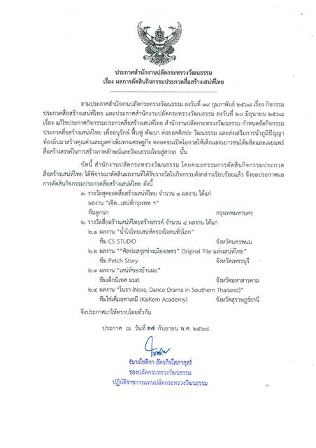 ทั้งนี้ สามารถดูรายละเอียดการประกาศผลการประกวดได้ที่ แฟนเพจเฟซบุ๊กกองเฝ้าระวังทางวัฒนธรรม เว็บไซต์ https://surveillance.m-culture.go.th/th