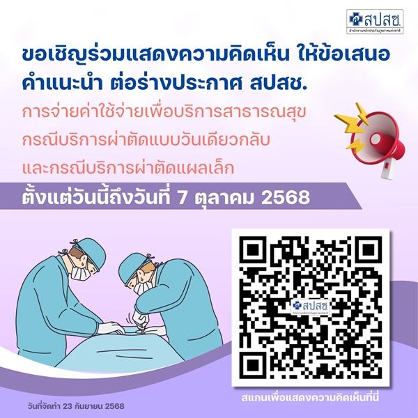 ขอเชิญร่วมแสดงความคิดเห็น ต่อร่างประกาศ สปสช. กรณีบริการผ่าตัดแบบวันเดียวกลับและกรณีบริการผ่าตัดแผลเล็ก ตั้งแต่วันนี้- 7 ต.ค.68