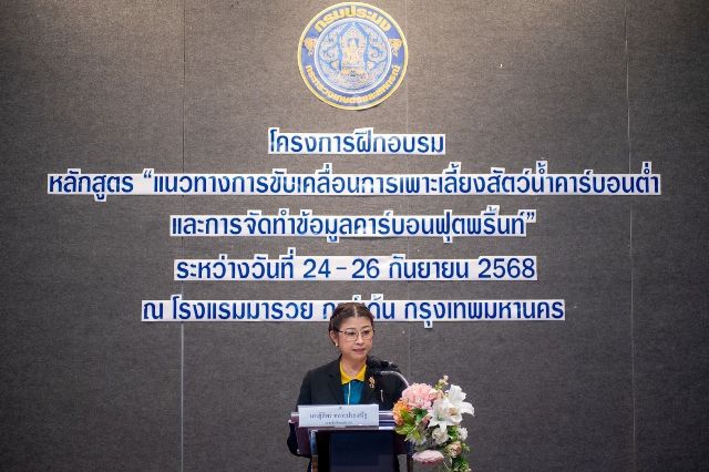 สำหรับการฝึกอบรม หลักสูตร “แนวทางการขับเคลื่อนการเพาะเลี้ยงสัตว์น้ำคาร์บอนต่ำ และการจัดทำข้อมูลคาร์บอนฟุตพริ้นท์” จัดขึ้นระหว่างวันที่ 24-26 กันยายน 2568 มีวัตถุประสงค์เพื่อเสริมสร้างความรู้ความเข้าใจให้กับเจ้าหน้าที่ผู้ปฏิบัติงานและเตรียมความพร้อมสำหรับการปรับเปลี่ยนไปสู่ระบบการเพาะเลี้ยงสัตว์น้ำแบบคาร์บอนต่ำ โดยมีเจ้าหน้าที่หน่วยงานในสังกัดกรมประมง ได้แก่ กองวิจัยและพัฒนาการเพาะเลี้ยงสัตว์น้ำชายฝั่ง กองวิจัยและพัฒนาการเพาะเลี้ยงสัตว์น้ำจืด และสำนักงานประมงจังหวัด เข้าร่วมกว่า 120 ราย มีการบรรยายให้ความรู้ในหัวข้อต่าง ๆ จากผู้เชี่ยวชาญ อาทิ นโยบายในการขับเคลื่อนการลดก๊าซเรือนกระจกของประเทศไทย แผนปฏิบัติการด้านการเกษตรเพื่อรองรับการเปลี่ยนแปลงสภาพภูมิอากาศ บทบาทขององค์การบริหารก๊าซเรือนกระจกและการรับรองคาร์บอนฟุตพริ้นท์ การลดการปล่อยก๊าซเรือนกระจกจากการเพาะเลี้ยงสัตว์น้ำ แนวทางในการจัดการฟาร์มเลี้ยงเพื่อลดการปล่อยคาร์บอน ตลอดจนทิศทางและนโยบายของกรมประมงในการส่งเสริมการเพาะเลี้ยงสัตว์น้ำคาร์บอนต่ำ จากนั้น จะคัดเลือกผู้เข้าอบรม 10 ราย เพื่อฝึกทักษะการปฏิบัติงานแบบเข้มข้น ด้านการเก็บข้อมูลในระบบการเพาะเลี้ยงสัตว์น้ำ การคำนวณคาร์บอนฟุตพริ้นท์ รวมถึงการวิเคราะห์จุดปล่อยคาร์บอนสูง และแนวทางการลดการปล่อยคาร์บอน เพื่อเสริมสร้างความรู้เกี่ยวกับการจัดเก็บข้อมูลภาคสนามที่เกี่ยวข้องได้อย่างถูกต้องและเป็นระบบ อีกทั้ง ยังเป็นการเตรียมความพร้อมเจ้าหน้าที่ในการสนับสนุนกระบวนการยื่นขอรับการรับรองคาร์บอนฟุตพริ้นท์ของเกษตรกรหรือผู้ประกอบการในอนาคต