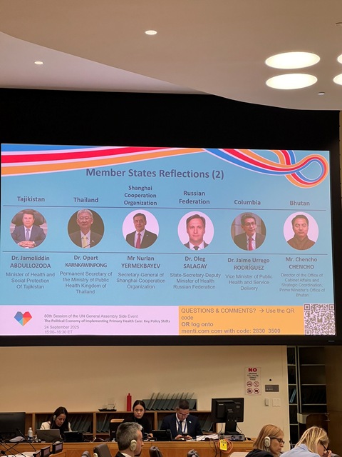 ปลัดกระทรวงสาธารณสุข นำทีมไทยเข้าร่วมประชุมระดับสูงของสมัชชาใหญ่แห่งสหประชาชาติฯ พร้อมรับรองปฏิญญาทางการเมืองฯ เร่งจัดการโรคไม่ติดต่อเรื้อรัง (NCDs) ให้ลดอัตราตายก่อนวัยอันควรลง 1 ใน 3 รวมถึงแสดงความเข้มแข็งระบบสาธารณสุขไทยด้วยการวางรากฐานบริการสุขภาพปฐมภูมิ และหารือเร่งรัดการบรรลุเป้าหมาย SDGs ด้านสาธารณสุขในภาวะวิกฤต การเตรียมพร้อมรับรอง Pandemic Agreement และการลงทุนด้านสุขภาพและสร้างหลักประกันสุขภาพอย่างยั่งยืน