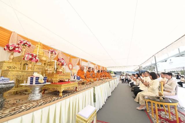 ในเวลา 09.19 น. เป็นการประกอบพิธีพราหมณ์ ซึ่งได้รับเกียรติจากพระครูสตานันทมุนี (ละมัย รัตนพราหมณ์) จากเทวสถานสำหรับพระนคร (โบสถ์พราหมณ์) และคณะ เป็นผู้ดำเนินพิธี ต่อจากนั้น ในเวลา 10.00 น. เป็นการประกอบพิธีสงฆ์ โดยมี พระเทพวรสิทธาจารย์ เจ้าอาวาสวัดเสมียนนารี พระอารามหลวง เป็นประธานฝ่ายพิธีสงฆ์