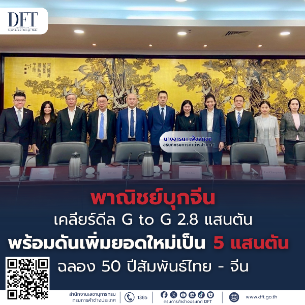 นางอารดา เฟื่องทอง อธิบดีกรมการค้าต่างประเทศ กระทรวงพาณิชย์ เปิดเผยว่า เมื่อวันที่ 17 – 19 กันยายน 2568 ได้นำคณะผู้แทนการค้าจากภาครัฐและภาคเอกชนไทยเดินทางเยือนกรุงปักกิ่ง สาธารณรัฐประชาชนจีน โดยได้เข้าพบผู้บริหารของ COFCO Corporation ซึ่งเป็นรัฐวิสาหกิจชั้นนำด้านการเกษตรและอาหารของจีน ณ กรุงปักกิ่ง โดยการหารือครั้งนี้มีวัตถุประสงค์สำคัญเพื่อเจรจาและเร่งรัดการซื้อขายข้าวที่ยังคงค้างจำนวน 280,000 ตัน ภายใต้สัญญาซื้อขายข้าวแบบรัฐต่อรัฐ (G to G) ตามบันทึกความเข้าใจว่าด้วยความร่วมมือด้านการค้าสินค้าเกษตรระหว่างไทย-จีน (MOU) และยังได้เสนอให้ COFCO ขยายปริมาณการนำเข้าข้าวจากไทยเพิ่มเป็น 500,000 ตัน เพื่อเป็นสัญลักษณ์แห่งมิตรภาพอันแน่นแฟ้น เนื่องในโอกาสครบรอบ 50 ปี ความสัมพันธ์ทางการทูตไทย–จีนในปีนี้ นอกจากนี้ ทั้งสองฝ่ายเห็นพ้องที่จะจัดทำความร่วมมือด้านการตลาดร่วมกันในการจัดกิจกรรมตลาดและประชาสัมพันธ์ข้าวไทยในตลาดจีน เพื่อเสริมสร้างการรับรู้ในคุณภาพและภาพลักษณ์ของข้าวไทยในหมู่ผู้บริโภคชาวจีนให้แพร่หลายมากยิ่งขึ้น ทั้งนี้ กรมการค้าต่างประเทศ (คต.) และ COFCO จะได้นำผลการหารือในครั้งนี้เสนอหน่วยงานระดับนโยบายของทั้งสองประเทศเพื่อพิจารณาดำเนินการต่อไป
