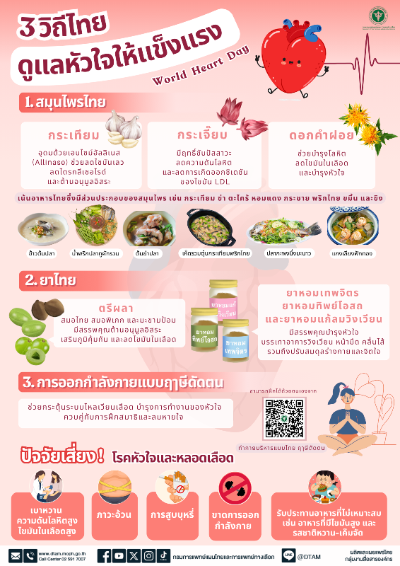 กรมการแพทย์แผนไทยและการแพทย์ทางเลือก ขอแนะนำ “3 วิถีไทย” แนวทางดูแลหัวใจอย่างครบวงจร ตามแบบฉบับภูมิปัญญาไทย ได้แก่ 1) สมุนไพรไทย เน้นสมุนไพรหลายชนิดมีสรรพคุณช่วยส่งเสริมการทำงานของหัวใจ และหลอดเลือด เช่น กระเทียม อุดมด้วยเอนไซม์อัลลิเนส (Allinase) ช่วยลดไขมันเลว ลดไตรกลีเซอไรด์ และ ต้านอนุมูลอิสระ ดอกคำฝอย ช่วยบำรุงโลหิต ลดไขมันในเลือด และบำรุงหัวใจ กระเจี๊ยบแดง มีฤทธิ์ขับปัสสาวะ ลดความดันโลหิต และ ลดการเกิดออกซิเดชันของไขมัน LDL ในส่วนเมนูอาหารที่อยากแนะนำให้รับประทานเพื่อช่วย บำรุงหัวใจ เน้นอาหารไทยประเภทน้ำพริกและเครื่องแกง ซึ่งมีส่วนประกอบของสมุนไพร กระเทียม ข่า ตะไคร้ หอมแดง กระชาย พริกไทย ขมิ้น และขิง เนื่องจากมีสารสำคัญกลุ่มน้ำมันหอมระเหย มีฤทธิ์ต้านอนุมูลอิสระช่วยย่อยอาหาร แก้อาการท้องอืด ท้องเฟ้อ เพิ่มการเผาผลาญพลังงาน ช่วยควบคุมไขมัน และ น้ำตาลในเลือด ช่วยเสริมการป้องกัน การเกิดโรคหัวใจและ หลอดเลือด เช่น น้ำพริกปลาทูผักรวม แกงเลียงฟักทอง ต้มยำปลา ข้าวต้มปลา เห็ดรวมตุ๋นกระเทียมพริกไทย ปลากะพงนึ่งมะนาว สำหรับเครื่องดื่มสมุนไพรที่เหมาะจะรับประทาน เช่น น้ำขิงน้ำผึ้ง น้ำเสาวรส น้ำกระเจี๊ยบแดง ชาดอกคำฝอย ชาขิง เป็นต้น ทั้งนี้ ควรหลีกเลี่ยงอาหารทอด อาหารที่มีไขมันสูง และรสชาติหวาน-เค็มจัด 2) ยาไทย ยาไทยมีบทบาทสำคัญในการดูแลสุขภาพหัวใจ อาทิ ยาตรีผลา ประกอบด้วยสมอไทย สมอพิเภก และมะขามป้อม มีสรรพคุณ ต้านอนุมูลอิสระ เสริมภูมิคุ้มกัน และลดไขมันในเลือด ยาหอม แนะนำกลุ่มยาหอมรสสุขุมเย็น เช่น ยาหอมเทพจิตร ยาหอมทิพย์โอสถ และยาหอมแก้ลมวิงเวียน มีสรรพคุณบำรุงหัวใจ บรรเทาอาการวิงเวียน หน้ามืด คลื่นไส้ รวมถึงปรับสมดุลร่างกายและจิตใจ 3) การออกกำลังกายแบบฤๅษีดัดตน เป็นการออกกำลังกายเชิงบูรณาการ ที่ช่วยกระตุ้นระบบไหลเวียนเลือด บำรุงการทำงานของหัวใจ ควบคู่กับการฝึกสมาธิและลมหายใจ ช่วยลดความเครียด ได้อย่างมีประสิทธิภาพ สามารถฝึกได้ด้วยตนเองจาก YouTube ช่องกรมการแพทย์แผนไทยและการแพทย์ทางเลือก