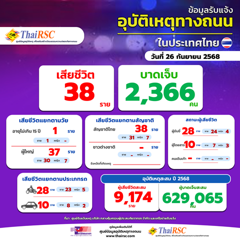 สถานการณ์อุบัติเหตุทางถนนในประเทศไทย วันที่ 26 กันยายน 2568 27 กันยายน 2025Thailandplusประชาสัมพันธ์ Facebook iconFacebookTwitter iconTwitterLINE iconLineสถานการณ์อุบัติเหตุทางถนนในประเทศไทย วันที่ 26 กันยายน 2568
