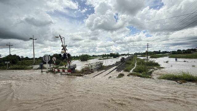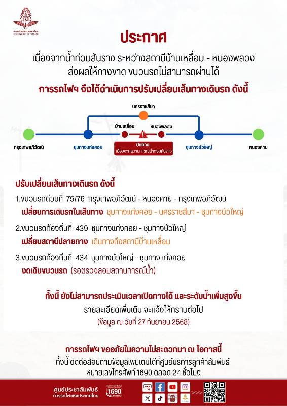 จากการตรวจสอบเบื้องต้น ยังไม่สามารถประมาณการเวลาในการเปิดทางได้ เนื่องจากระดับน้ำยังคงท่วมสูงและยังไม่มีแนวโน้มลดลง ทั้งนี้ การรถไฟฯ จะติดตามสถานการณ์อย่างใกล้ชิด และจะแจ้งรายละเอียดเพิ่มเติมให้ทราบ เมื่อมีความคืบหน้าในการเปิดเส้นทางเดินรถ ขออภัยในความไม่สะดวกมา ณ โอกาสนี้