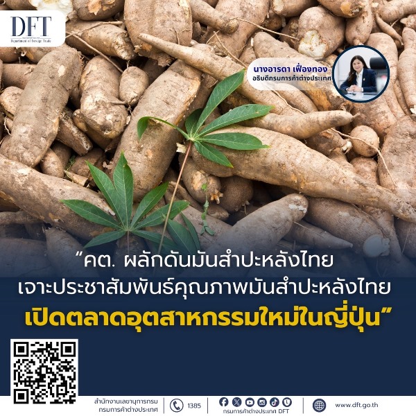 “การจัดคณะเดินทางของภาครัฐร่วมกับนักวิชาการไปยังเมืองฟูกูโอกะ และ เมืองคุมาโมโตะ ภูมิภาคคิวชู ประเทศญี่ปุ่น ระหว่างวันที่ 28 กันยายน – 2 ตุลาคม 2568 นี้ ถือเป็นการต่อยอดจากที่ไทยเคยส่งออกสินค้ามันสำปะหลังไปประเทศญี่ปุ่น โดยมีเป้าหมายเป็นการประชาสัมพันธ์สินค้ามันสำปะหลังไทยเข้าสู่อุตสาหกรรมใหม่ เพื่อเพิ่มโอกาสและช่องทางการส่งออกสินค้ามันสำปะหลังไทยที่มีมูลค่าเพิ่มสูงขึ้นไปยังอุตสาหกรรมที่หลากหลายมากขึ้น เช่น อุตสาหกรรมอาหารสัตว์ อุตสาหกรรมอาหารเพื่อสุขภาพ หรือแม้กระทั่งอุตสาหกรรมสัตว์เลี้ยง ซึ่งอุตสาหกรรมทั้งหมดกำลังมีแนวโน้มเติบโต ซึ่งจะเป็นโอกาสที่ดีสำหรับการส่งออกสินค้ามันสำปะหลังไทยไปยังประเทศญี่ปุ่นและเป็นการสร้างรายได้เข้าสู่ประเทศได้มากยิ่งขึ้น”