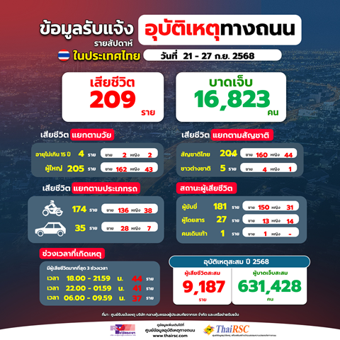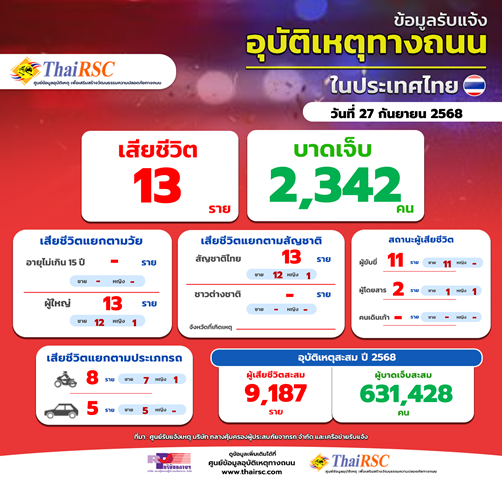 สถานการณ์อุบัติเหตุทางถนนในประเทศไทย รายสัปดาห์ 21 – 27 ก.ย.68 28 กันยายน 2025Thailandplusประชาสัมพันธ์ Facebook iconFacebookTwitter iconTwitterLINE iconLineสถานการณ์อุบัติเหตุทางถนนในประเทศไทย วันที่ 27 กันยายน 2568