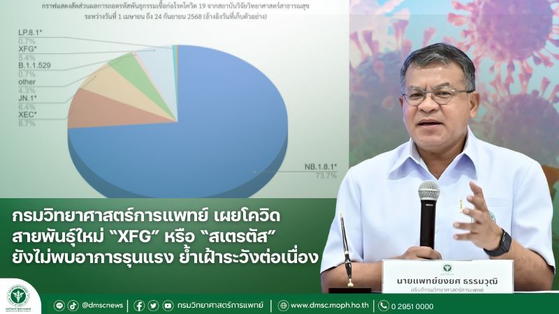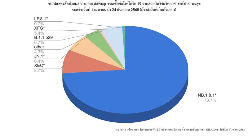 ขณะเดียวกัน กรมวิทยาศาสตร์การแพทย์ได้ถอดรหัสพันธุกรรมเชื้อโควิด 19 อย่างต่อเนื่อง โดยในช่วง 1 เมษายน – 24 กันยายน 2568 ได้ทำการถอดรหัสแล้ว 608 ตัวอย่าง พบว่าเป็น สายพันธุ์ NB.1.8.1* ร้อยละ 73.7 สายพันธุ์ XEC* ร้อยละ 8.7 สายพันธุ์ JN.1* ร้อยละ 6.4 สายพันธุ์ XFG* ร้อยละ 5.4 สายพันธุ์อื่น ๆ รวมร้อยละ 5.7