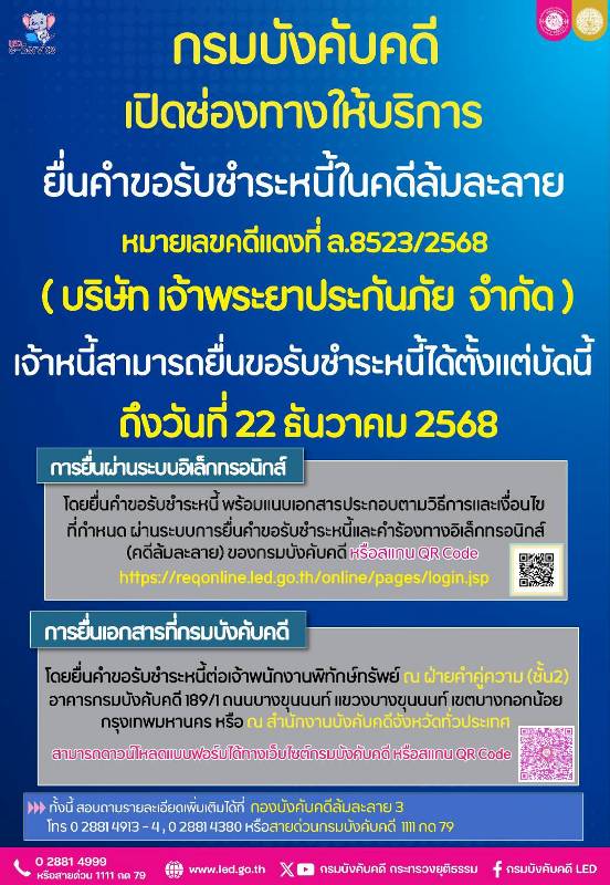 นายเสกสรร สุขแสง อธิบดีกรมบังคับคดี เปิดเผยว่า ตามที่ศาลล้มละลายกลางได้มีคำสั่งพิทักษ์ทรัพย์เด็ดขาด บริษัท เจ้าพระยาประกันภัย จำกัด เมื่อวันที่ 10 กันยายน 2568 หมายเลขแดงที่ ล. 8523/2568 โดยบรรดาเจ้าหนี้สามารถยื่นคำขอรับชำระหนี้ต่อเจ้าพนักงานพิทักษ์ทรัพย์ หรือผ่านทางระบบอิเล็กทรอนิกส์ ได้ตั้งแต่บัดนี้ ถึงวันที่ 22 ธันวาคม 2568 เวลา 16.30 น. ซึ่งเจ้าหนี้สามารถยื่นขอรับชำระหนี้จากกองทรัพย์สินของลูกหนี้ได้ตามวิธีการดังนี้