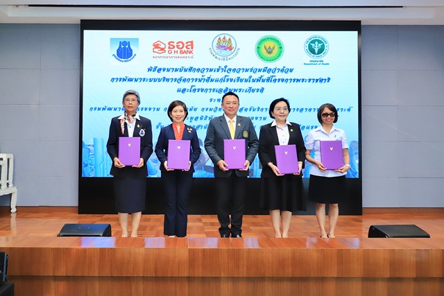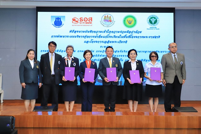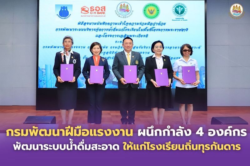 30 ก.ย. 68 เวลา 09.30 น. นายเดชา พฤกษ์พัฒนรักษ์ อธิบดีกรมพัฒนาฝีมือแรงงาน นางพจมาน ท่าจีน รองอธิบดีกรมวิทยาศาสตร์บริการ รักษาราชการแทนอธิบดีกรมวิทยาศาสตร์บริการ นางสาวยุพิน โจ้แปง ผู้อำนวยการสำนักสุขาภิบาลอาหารและน้ำ กรมอนามัย นางสาวธิดาพร มีกิ่งทอง รองกรรมการผู้จัดการธนาคารอาคารสงเคราะห์ และนางสุทัศนี สืบวงศ์แพทย์ ประธานมูลนิธิพัฒนาฝีมือแรงงาน ร่วมกันลงนามบันทึกข้อตกลงความร่วมมือว่าด้วยการพัฒนาระบบบริหารจัดการน้ำดื่มแก่โรงเรียนในพื้นที่โครงการพระราชดำริและโครงการเฉลิมพระเกียรติ โดยมีผู้บริหารของแต่ละหน่วยงานร่วมกันเป็นพยานลงนาม ณ ห้องประชุม ชั้น 6 อาคารสำนักงาน สูง 6 ชั้น กรมพัฒนาฝีมือแรงงาน