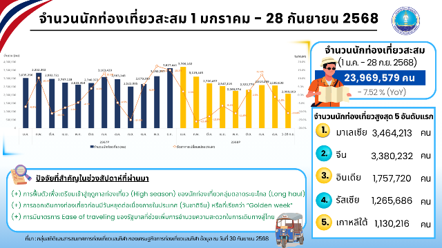 สรุปภาพรวมการท่องเที่ยวในสัปดาห์นี้ โดยข้อมูล ณ วันที่ 29 ก.ย. 68 พบว่า ประเทศไทย มีจำนวนนักท่องเที่ยวชาวต่างชาติสะสมตั้งแต่วันที่ 1 ม.ค. – 28 ก.ย. 68 ที่ผ่านมาทั้งสิ้น 23,969,579 คน สร้างรายได้จากการใช้จ่ายของนักท่องเที่ยวต่างชาติแล้วประมาณ 1,106,645 ล้านบาท โดยจำนวนนักท่องเที่ยวสูงสุด 5 อันดับแรก ได้แก่ มาเลเซีย (3,464,213 คน) จีน (3,380,232 คน) อินเดีย (1,757,720 คน) รัสเซีย (1,265,686 คน) และเกาหลีใต้ (1,130,216 คน)