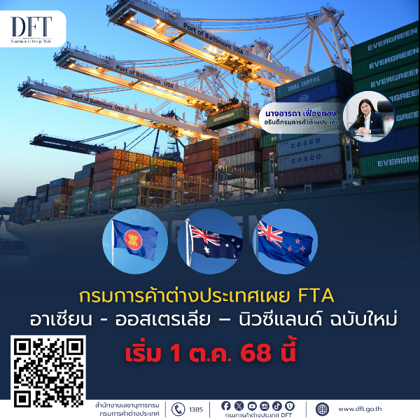 นางอารดา เฟื่องทอง อธิบดีกรมการค้าต่างประเทศ เปิดเผยว่า ตั้งแต่วันที่ 1 ตุลาคม 2568 เป็นต้นไป ความตกลง AANZFTA ฉบับใหม่ หรือที่เรียกว่า พิธีสารฉบับที่สองเพื่อแก้ไขความตกลง AANZFTA ที่ได้มีการแก้ไขปรับปรุงความตกลงฉบับเดิมให้มีความทันสมัยและรองรับรูปแบบทางการค้าใหม่ ๆ กำลังจะมีผลบังคับใช้ระหว่างไทยกับ 7 ประเทศ ได้แก่ ออสเตรเลีย นิวซีแลนด์ สิงคโปร์ บรูไนดารุสซาลาม มาเลเซีย สปป.ลาว และเวียดนาม และตั้งแต่วันที่ 12 ตุลาคม 2568 เป็นต้นไป กับเมียนมา ซึ่งกรมการค้าต่างประเทศได้เตรียมการสำหรับการบังคับใช้ของพิธีสารฉบับที่สองดังกล่าวไว้พร้อมแล้ว