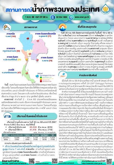 2. สถานการณ์น้ำอ่างเก็บน้ำในภาพรวม : ปริมาณน้ำรวม 81% ของความจุเก็บกัก (65,539 ล้าน ลบ.ม.) ปริมาณน้ำใช้การ 71% (41,418 ล้าน ลบ.ม.) เฝ้าระวังแหล่งน้ำขนาดใหญ่ปริมาณน้ำสูงกว่าเกณฑ์เก็บกักสูงสุด จำนวน 7 แห่ง ดังนี้ ภาคเหนือ : อ่างเก็บน้ำแม่มอก และแควน้อยบำรุงแดน ภาคตะวันออกเฉียงเหนือ : อ่างเก็บน้ำห้วยหลวง น้ำอูน และอุบลรัตน์ และภาคตะวันออก : อ่างเก็บน้ำบางพระและนฤบดินทรจินดา