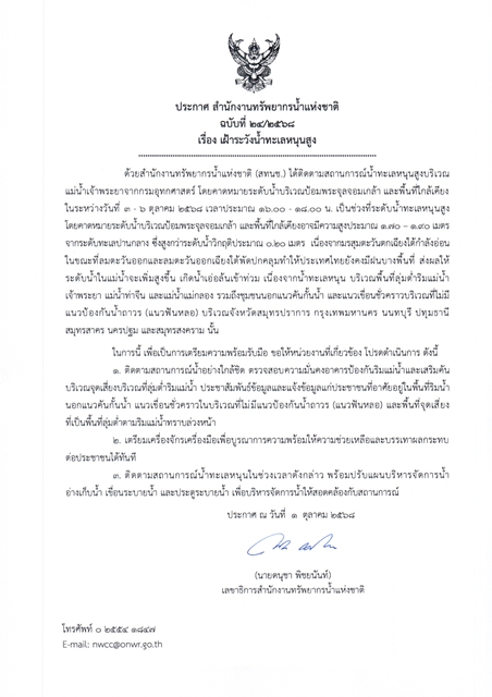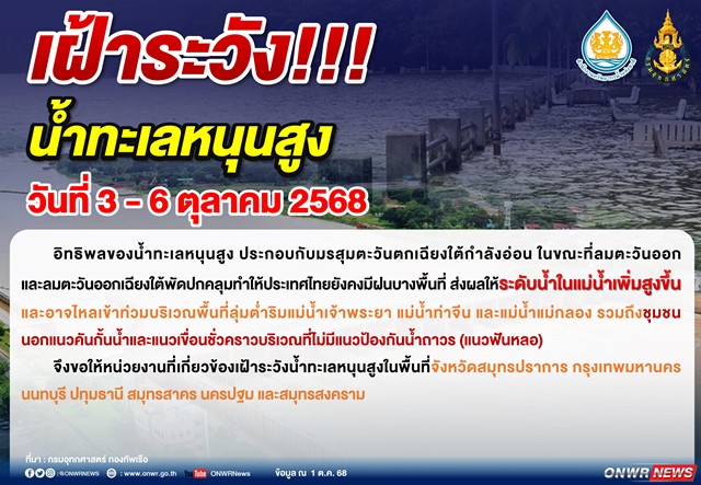 ด้วยสำนักงานทรัพยากรน้ำแห่งชาติ (สทนช.) ได้ติดตามสถานการณ์น้ำทะเลหนุนสูงบริเวณแม่น้ำเจ้าพระยาจากกรมอุทกศาสตร์ โดยคาดหมายระดับน้ำบริเวณป้อมพระจุลจอมเกล้า และพื้นที่ใกล้เคียง ในระหว่างวันที่ 3 – 6 ตุลาคม 2568 เวลาประมาณ 16.00 – 18.00 น. เป็นช่วงที่ระดับน้ำทะเลหนุนสูง โดยคาดหมายระดับน้ำบริเวณป้อมพระจุลจอมเกล้า และพื้นที่ใกล้เคียงอาจมีความสูงประมาณ 1.70 – 1.90 เมตร จากระดับทะเลปานกลาง ซึ่งสูงกว่าระดับน้ำวิกฤติประมาณ 0.20 เมตร เนื่องจากมรสุมตะวันตกเฉียงใต้กำลังอ่อน ในขณะที่ลมตะวันออกและลมตะวันออกเฉียงใต้พัดปกคลุมทำให้ประเทศไทยยังคงมีฝนบางพื้นที่ ส่งผลให้ระดับน้ำในแม่น้ำจะเพิ่มสูงขึ้น เกิดน้ำเอ่อล้นเข้าท่วม เนื่องจากน้ำทะเลหนุน บริเวณพื้นที่ลุ่มต่ำริมแม่น้ำเจ้าพระยา แม่น้ำท่าจีน และแม่น้ำแม่กลอง รวมถึงชุมชนนอกแนวคันกั้นน้ำ และแนวเขื่อนชั่วคราวบริเวณที่ไม่มีแนวป้องกันน้ำถาวร (แนวฟันหลอ) บริเวณจังหวัดสมุทรปราการ กรุงเทพมหานคร นนทบุรี ปทุมธานี สมุทรสาคร นครปฐม และสมุทรสงคราม นั้น