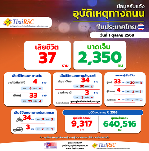 สถานการณ์อุบัติเหตุทางถนนในประเทศไทย วันที่ 1 ตุลาคม 2568 2 ตุลาคม 2025Thailandplusประชาสัมพันธ์ Facebook iconFacebookTwitter iconTwitterLINE iconLineสถานการณ์อุบัติเหตุทางถนนในประเทศไทย วันที่ 1 ตุลาคม 2568
